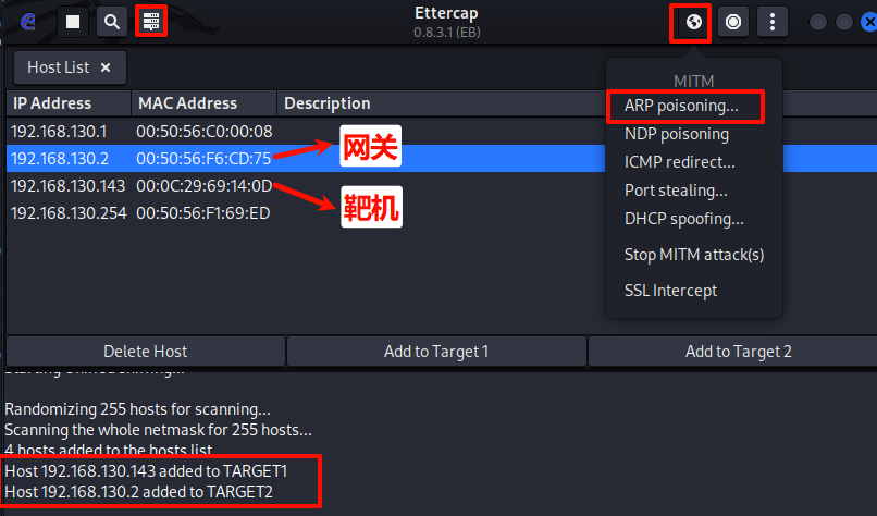 在host list中查看扫描结果。分别将靶机IP和网关地址设为目标1和目标2。