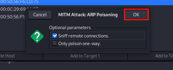 在MITM菜单中选择ARP Poisoning,点击ok开始攻击。
