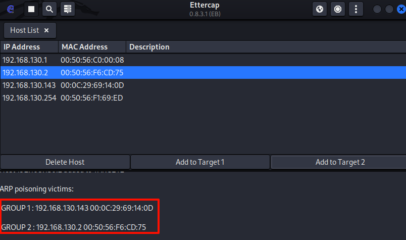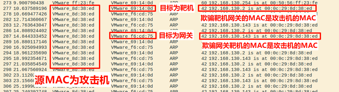 Info (核心内容): "192.168.130.2 is at 00:0c:29:8d:38:ed",这句是关键的谎言。