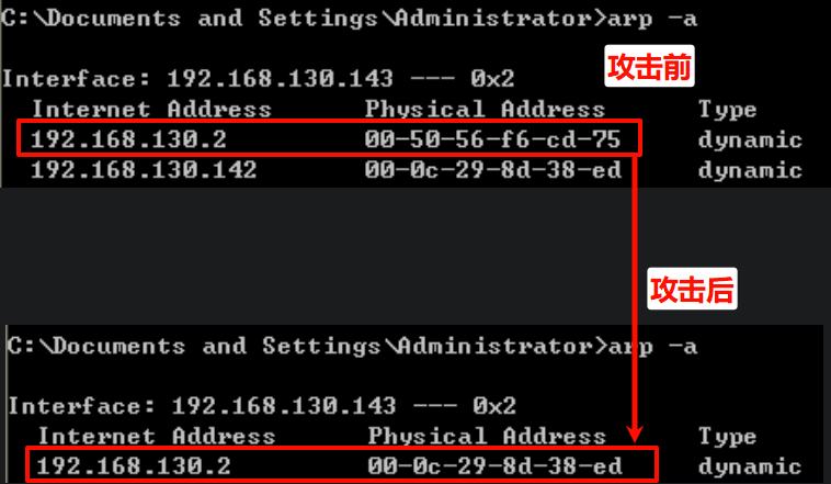 此时网关的MAC地址已经被篡改为攻击机的MAC地址 。