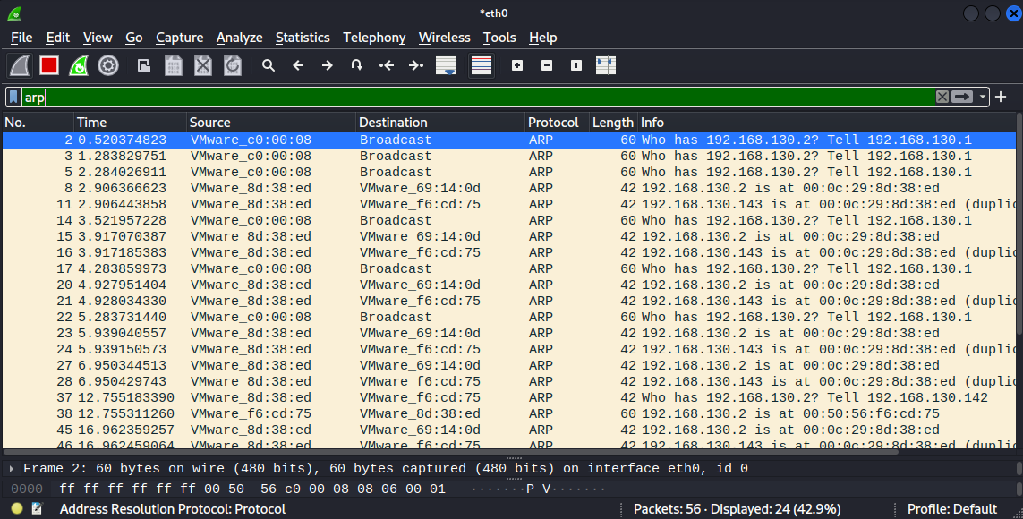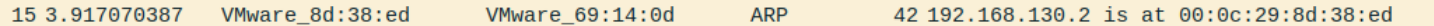 1 2 No. Time 3Source Destination Protocol Length Info 15 3.917185383 VMware_8d:38:ed VMware_69:14:0d ARP 42 192.168.130.2 is at 00:0c:29:8d:38:ed