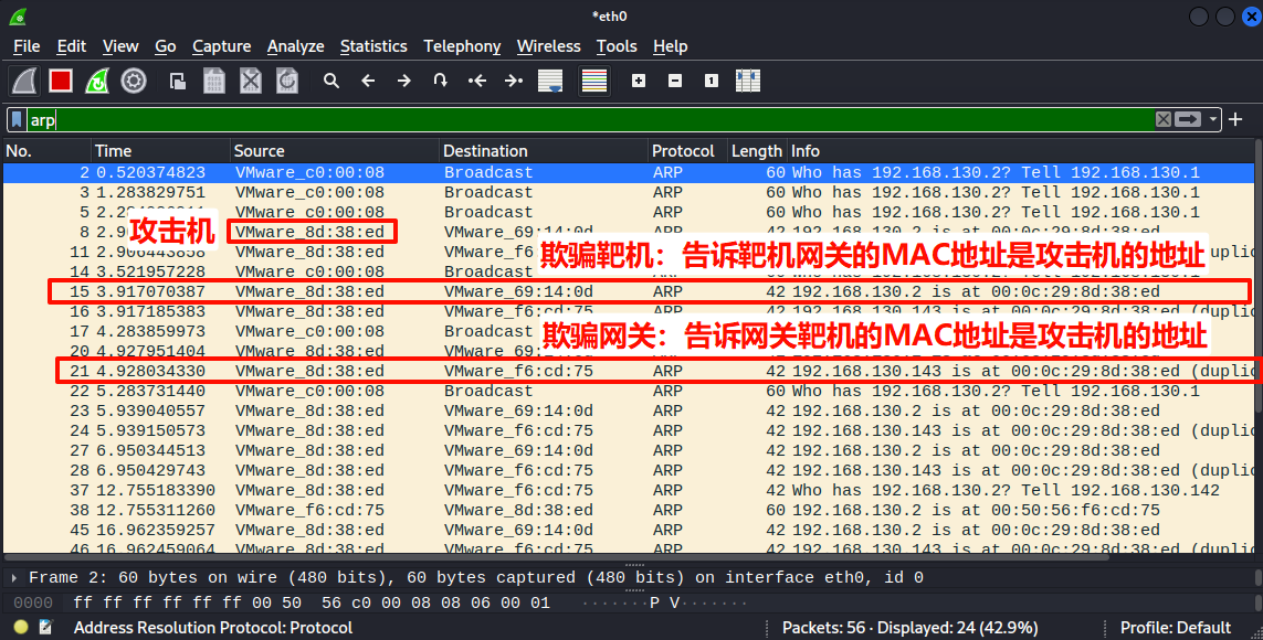 Source (源MAC): VMware_8d:38:ed (00:0c:29:8d:38:ed),这是攻击机的真实MAC地址。