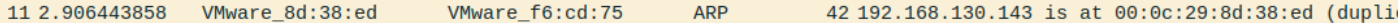 1 No. Time Source Destination Protocol Length Info 11 2.906443858 VMware_8d:38:ed VMware_f6:cd:75 ARP 42 192.168.130.143 is at 00:0c:29:8d:38:ed (duplicate use of 192.168.130.2)