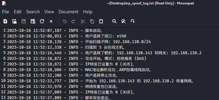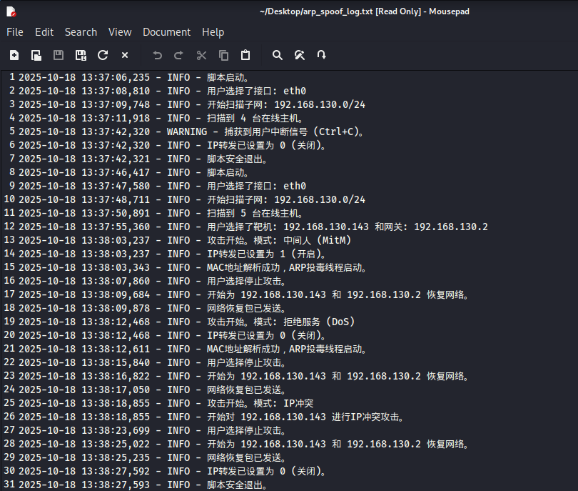 造成的影响: 当网关 (192.168.130.2) 收到这个包后,它也会更新自己的ARP缓存表,建立起另一条错误的映射关系:[靶机IP: 192.168.130.143] -> [攻击机MAC: 00:0c:29:8d:38:ed] 。从此以后,网关收到的、要发给靶机的数据(例如网页的响应内容),都会被发送到攻击机的网卡上。
