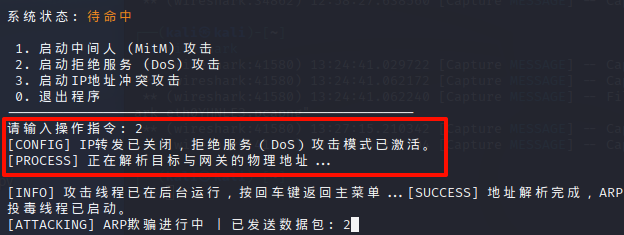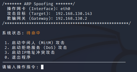 支持三种基于ARP的攻击模式:中间人攻击、拒绝服务攻击、IP地址冲突攻击