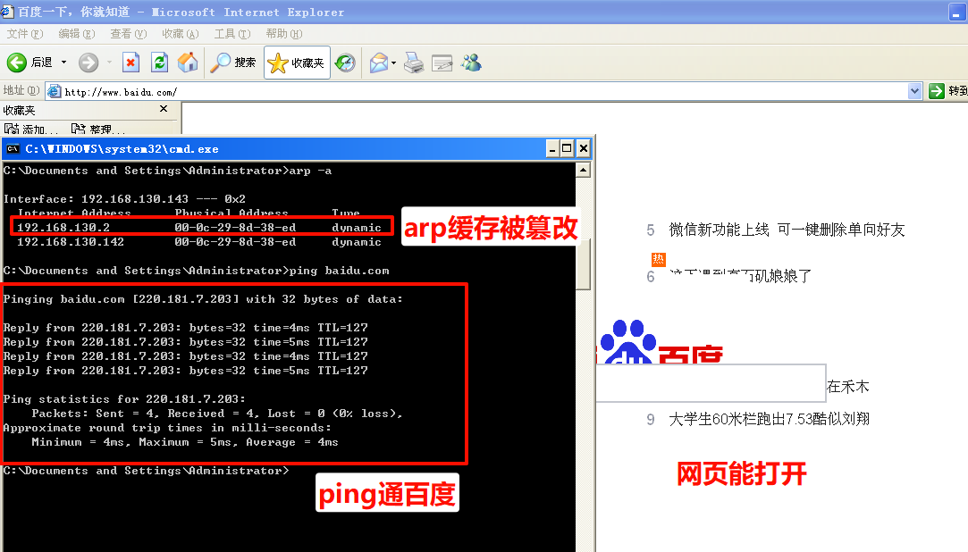 靶机arp缓存被篡改,但是能正常打开百度