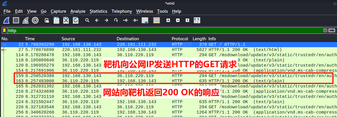 请求 (Request) :可以看到多条源地址(Source)为 192.168.130.143 的数据包,它们正在向一个公网IP 36.110.220.119(某个网站的服务器)发送HTTP GET请求。这代表靶机正在请求网页内容。