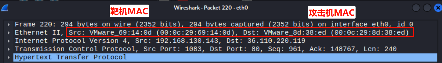 Source (源MAC): VMware_8d:38:ed (00:0c:29:8d:38:ed),依然是攻击机 的真实MAC地址。