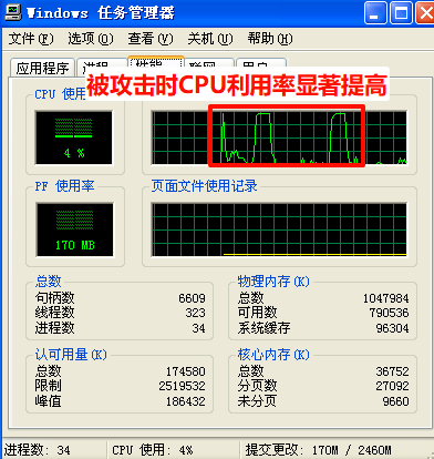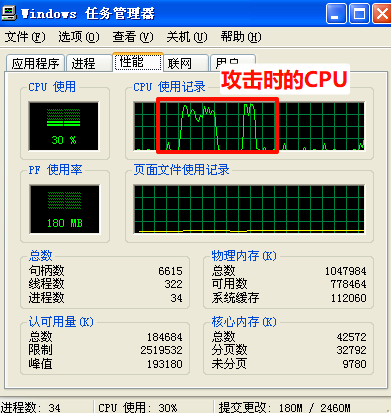 windows XP被攻击时直接卡死。因此停止攻击后再查看Windows XP任务管理器。看到被攻击时的CPU占用率显著提高