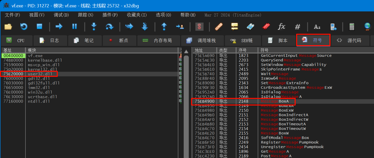 加载程序,运行几步后查看“符号”,在user32.dll中找到MessageBoxA的地址:75EB4900