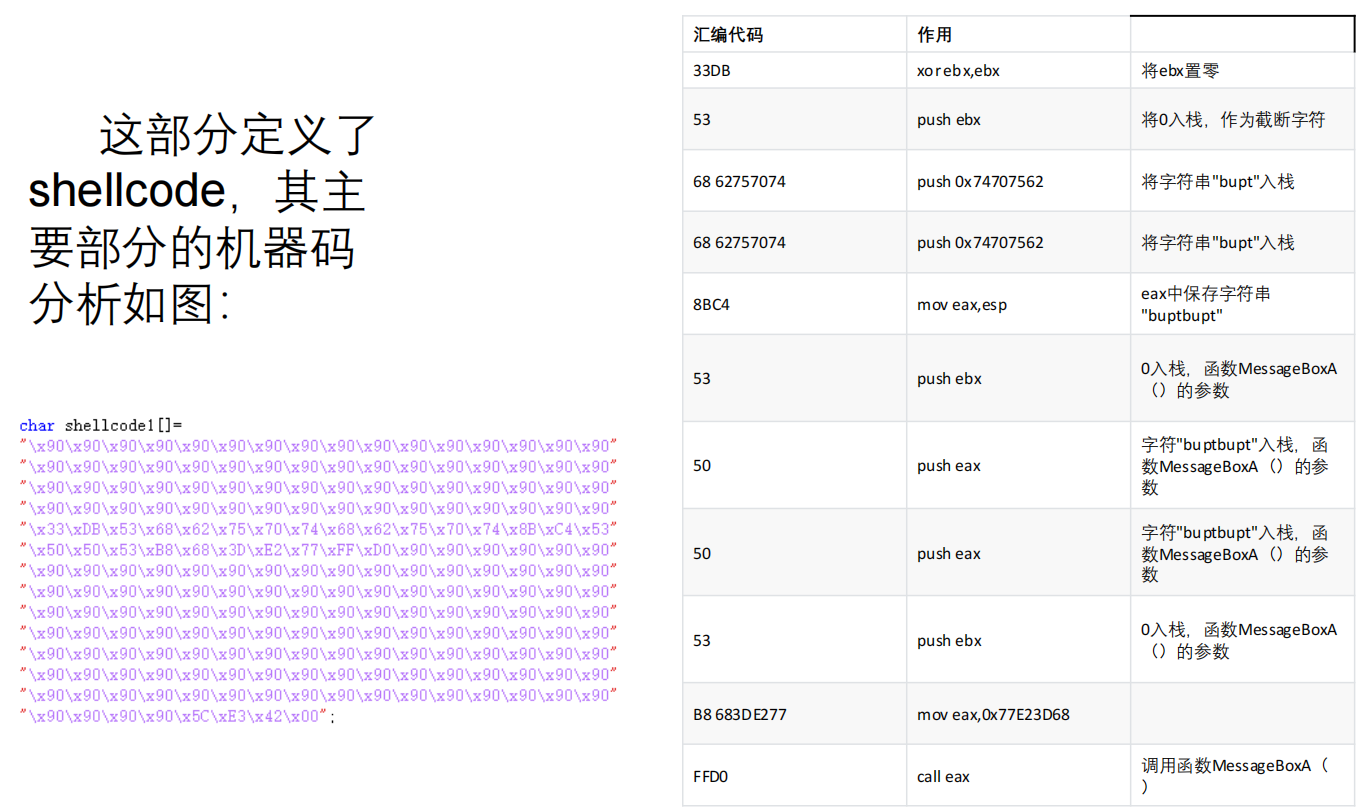 提供的 shellcode1 数组中包含了一段汇编机器码,其功能是调用 Windows 的 MessageBoxA 函数弹出一个窗口。