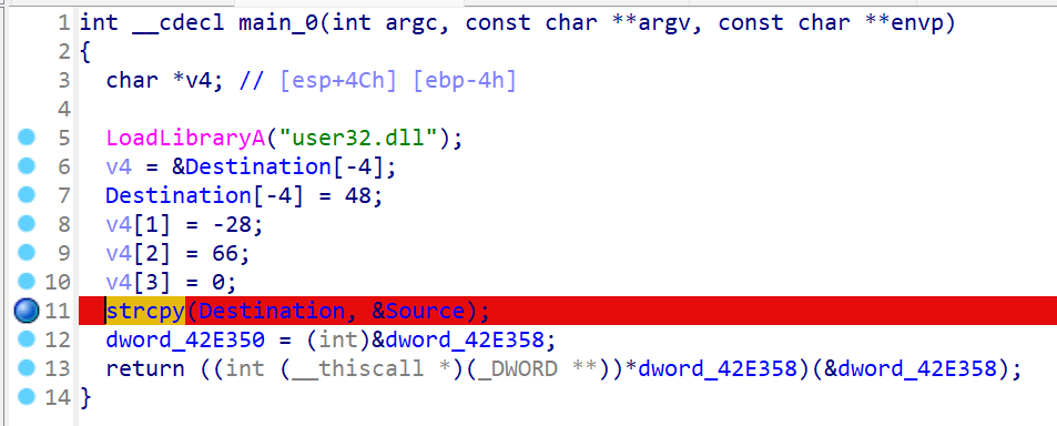 在 strcpy(overflow.buf, shellcode1); 这一行打断点