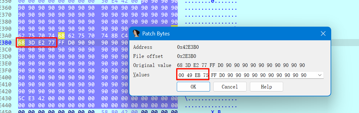 | 【修改点 1】:MessageBoxA 地址 原代码: ... \xB8\x68\x3D\xE2\x77 ... 修改为: \xB8\x00\x49\xEB\x75 (对应 0x75EB4900)