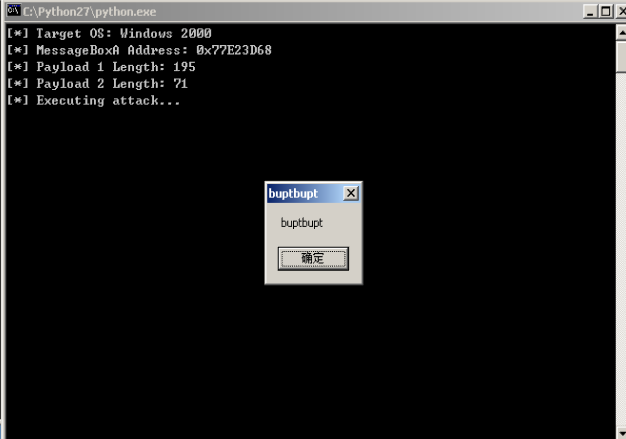 print "[*] Target OS: Windows 2000" print "[*] MessageBoxA Address: 0x%08X" % addr_messagebox