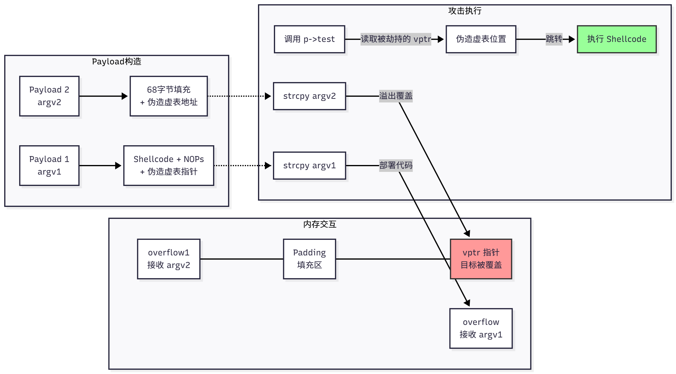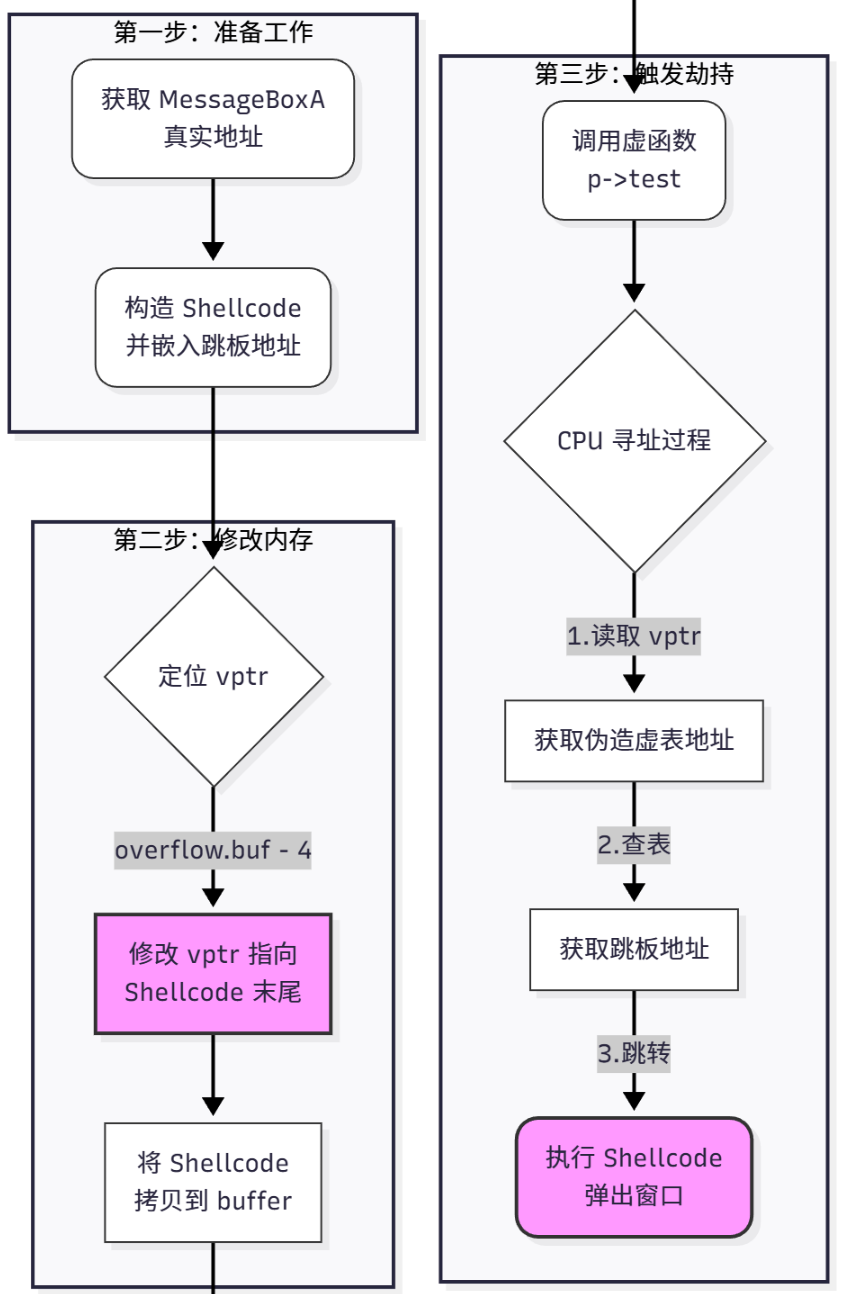 - 虚函数表 (vtable) 里面存放的才是 真正的函数地址 (Shellcode Start)。